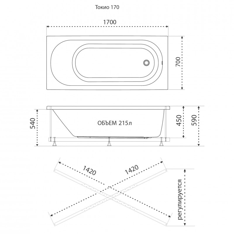 Ванна 170*70*45. Форма - прямоугольная. Для изготовления ванны используется Российский лист АБС/ПММА (сантехнический акрил) от компании "Гибау". Изначальная толщина листа 5 мм., толщина армирующего слоя (стекловолокно+смола) от 2 до 6 мм. (напыляется на разные части дна по разному). На дне ванны идёт закладная — цельное ДСП. Выдерживает нагрузку до 500 кг.
